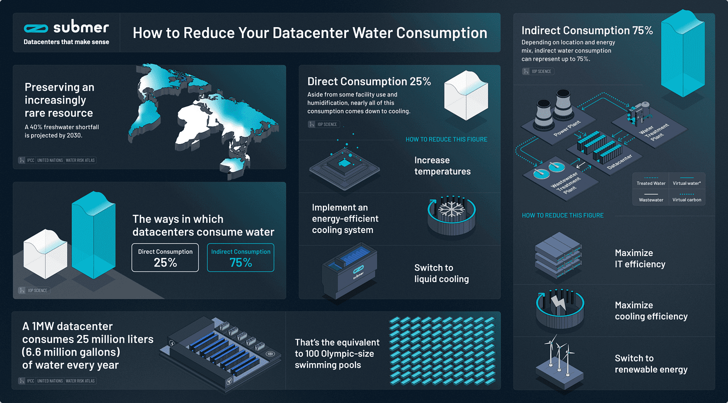 2. Water Usage: 25% is direct (it’s basically all for cooling) and 75% is indirect (electricity generation, waste water treatment, etc.). The global AI demand may require 4.2 to 6.6 billion cubic meters of water withdrawal by 2027, which is 4 to 6 times the total annual withdrawal of Denmark.