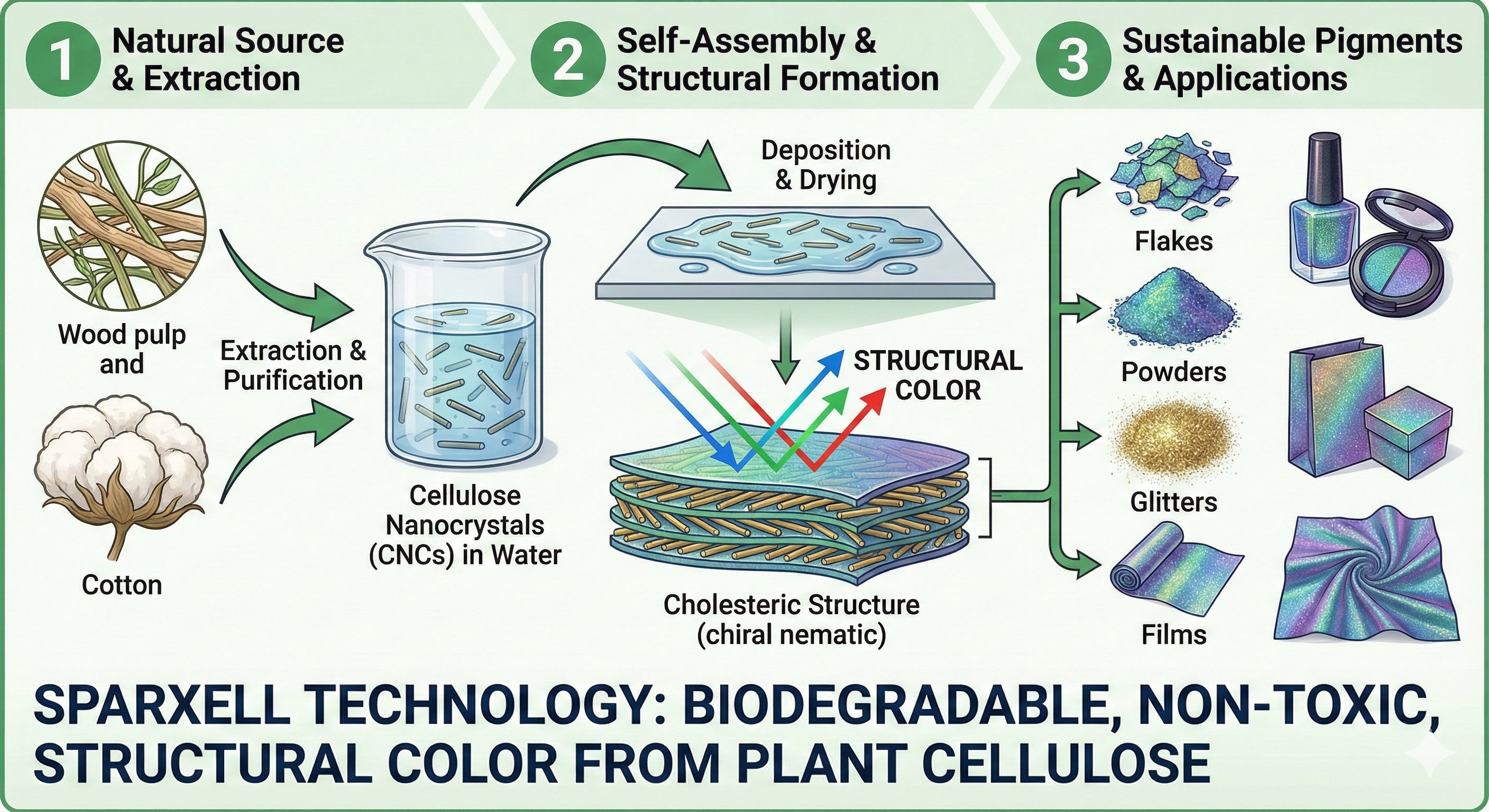 The Process: The cellulose crystals are dispersed in water, then dried into an iridescent film. By controlling how densely the crystals pack, they can produce any color in the spectrum. The film is then ground into pigments, glitters, etc.