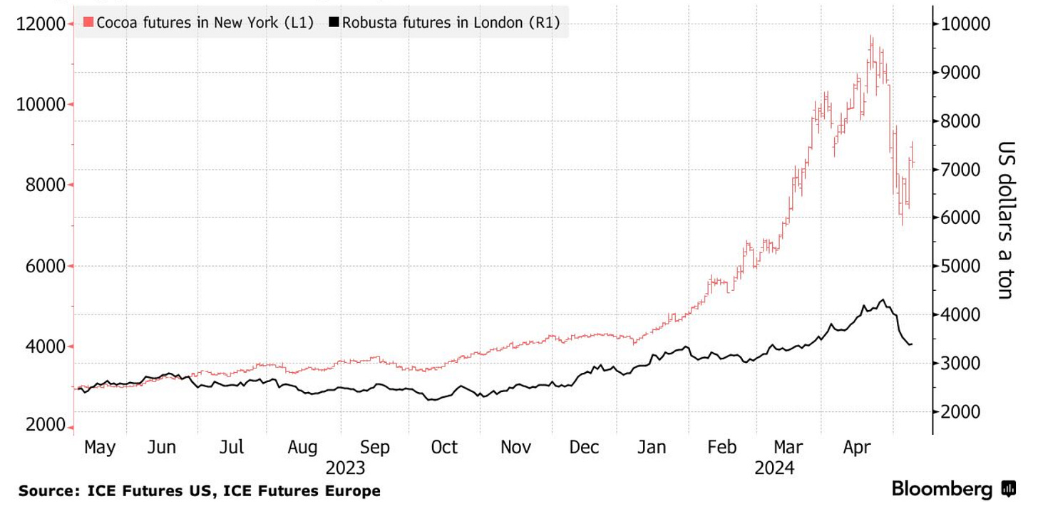 2. Cocoa in Free Fall: Cocoa prices quadrupled between 2023 and 2024, spiking from $3,000 to $12,000 per metric ton, the highest in 50 years. Ghana and Côte d'Ivoire, which produce 70% of global cocoa, saw devastating harvest losses from extreme weather and disease outbreaks.