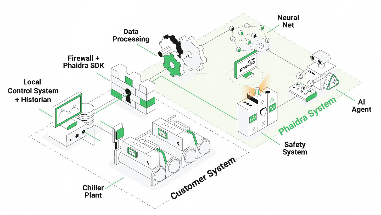 Works Anywhere With Complex Cooling: The same tech applies beyond data centers. Phaidra’s first major customer was Merck, across a 500-acre vaccine plant, and they’re now running a pilot with the UAE Ministry of Energy for district cooling operations.